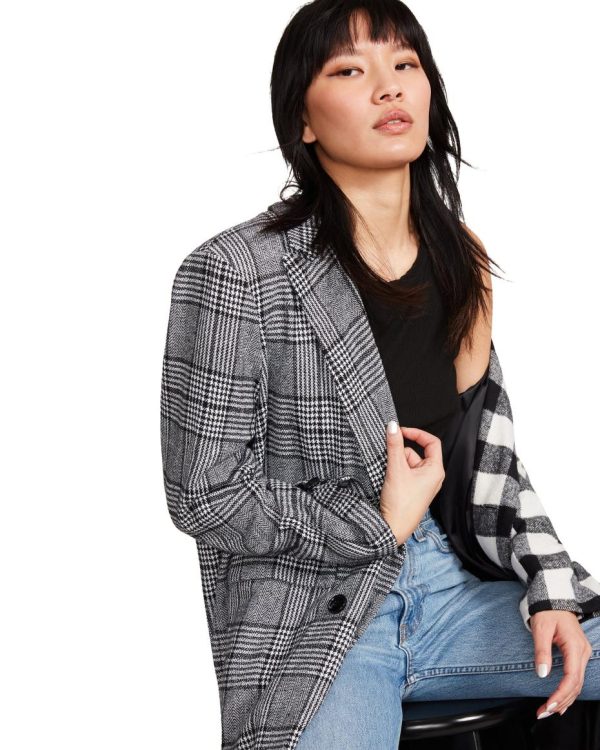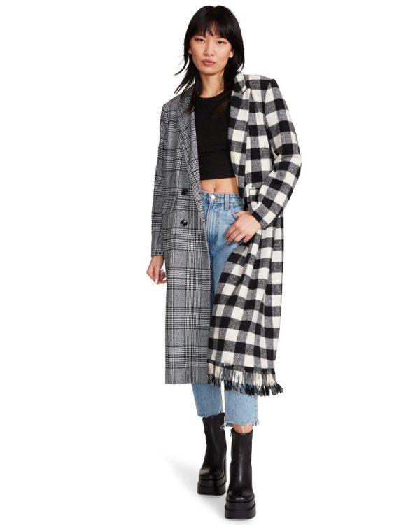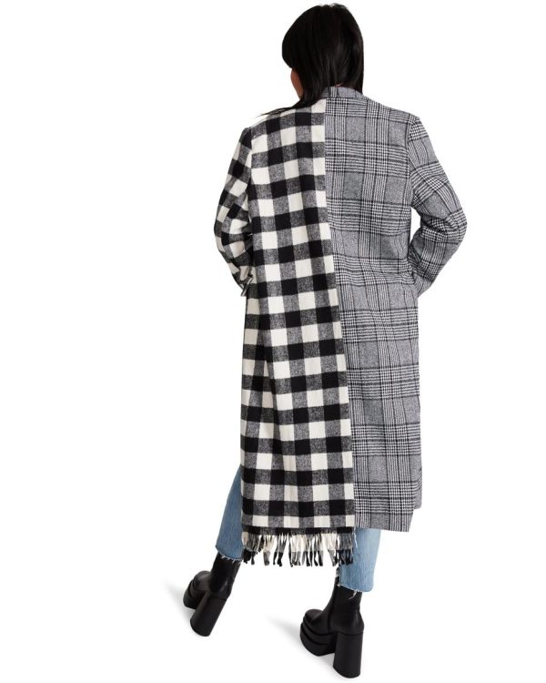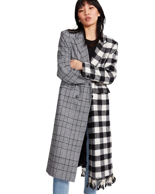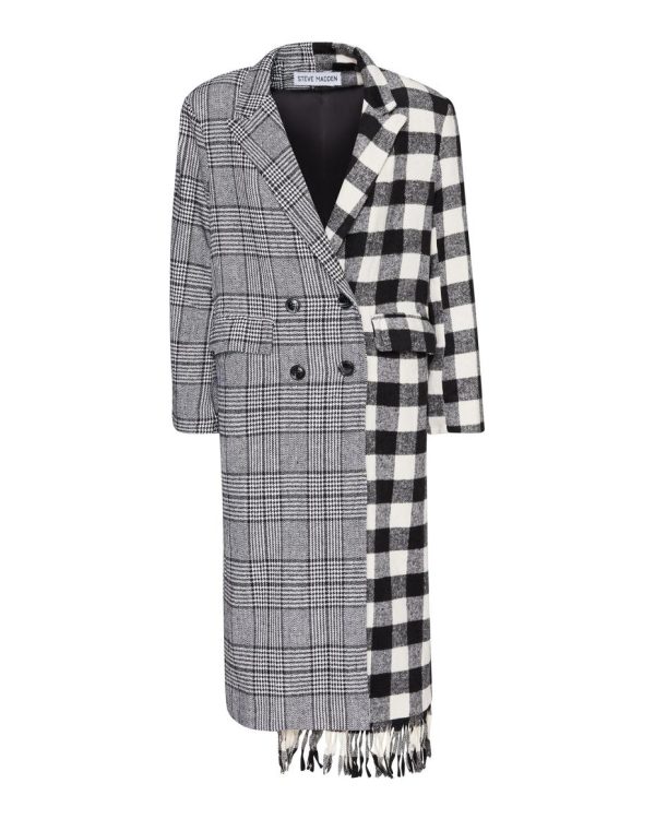 Chilly weather has met its match. This two-toned trench coat is our new go-to, featuring mixed plaid materials and fringe details.