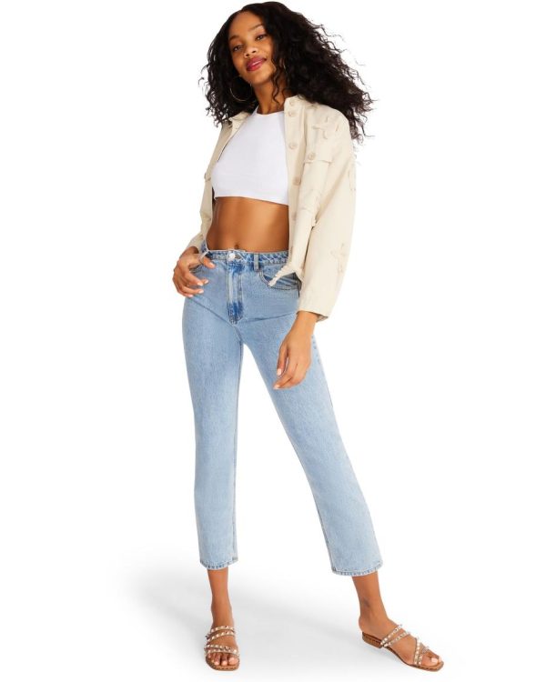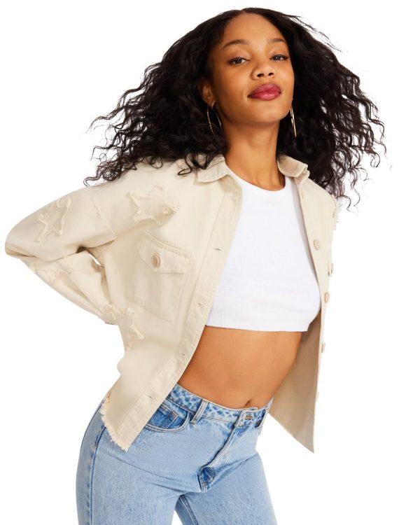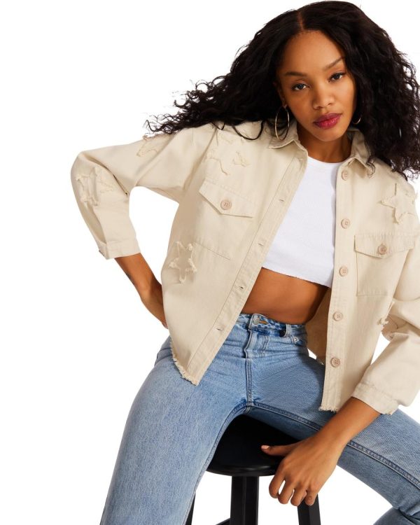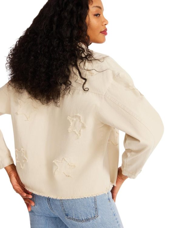 A staple button-up jacket features tonal star pattern stitching and a frayed hem for just the right amount of edge.